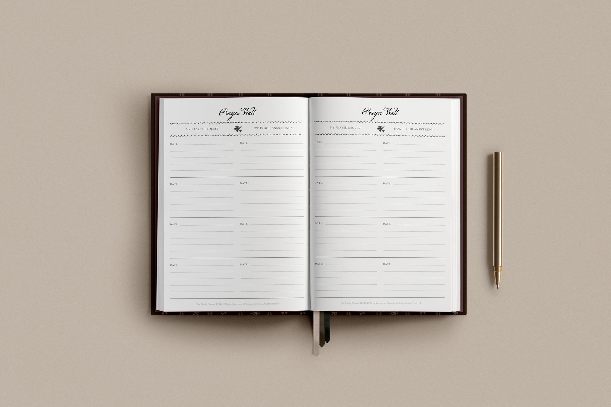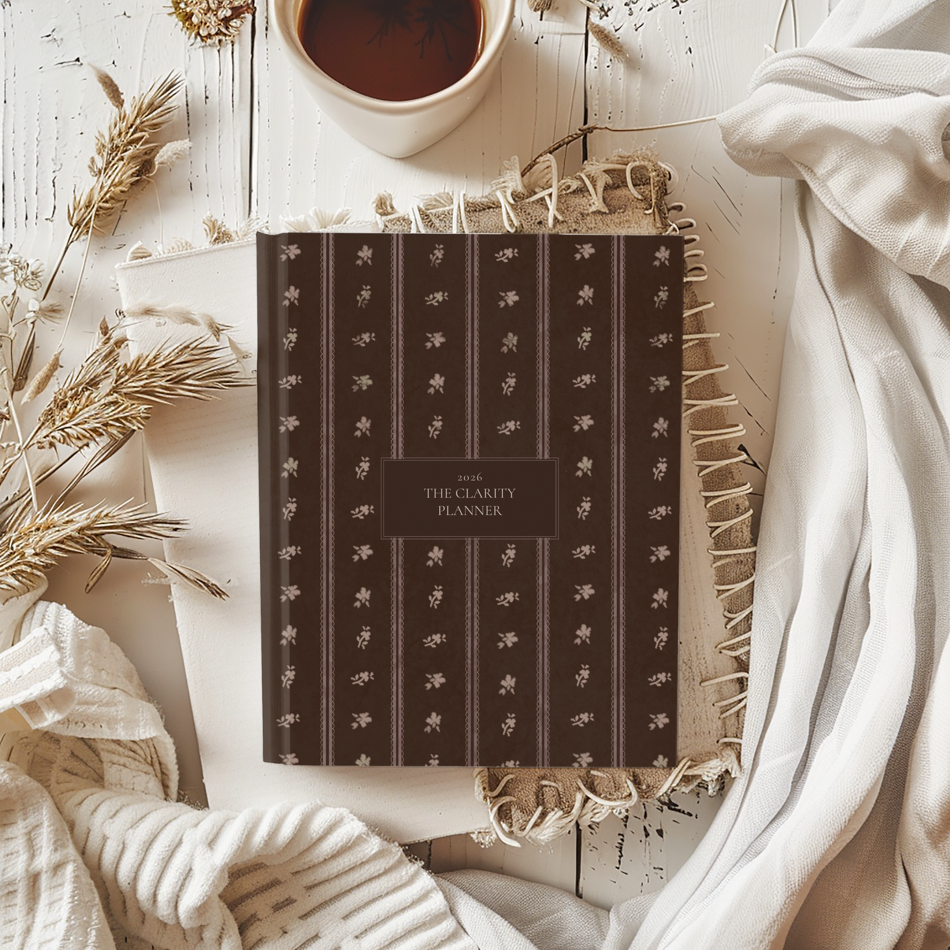 The Daily Version of the Clarity Planner devotes one full page to each day of the year. It comes in casebound hardcover, featuring an original pattern of rich chestnut with tan florals nestled between scalloped and straight lines. The dark color is classic and has a smooth finish for easy cleaning.