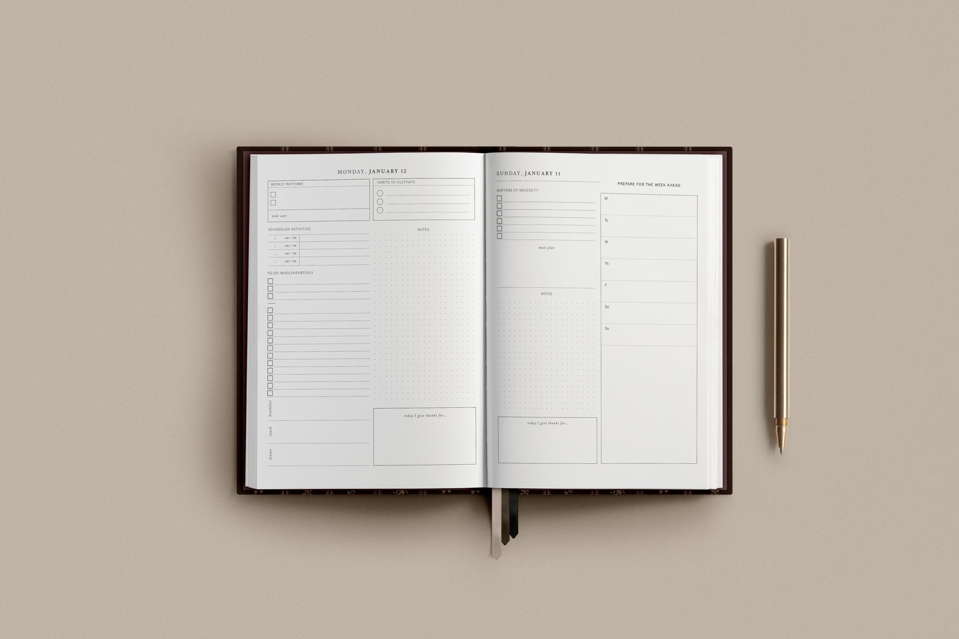 - Daily pages include : to-do/top 3 list, weekly rhythms, meal plan, scheduled activities, gratitude space, and dotted note block